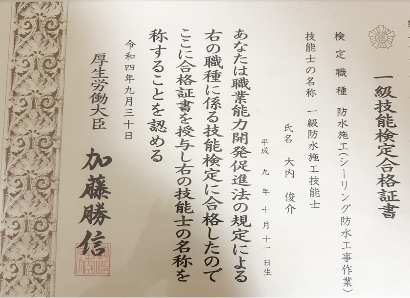 OS Groupには、「防水施工技能士」という資格を所有する職人が在籍しております。