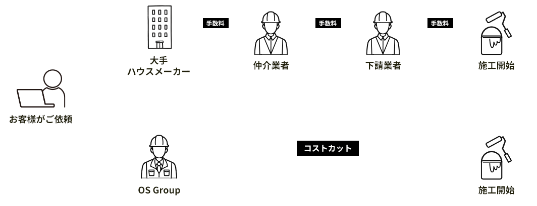OS Groupでは、ご依頼からお引渡しまですべて一括で担当しているため、無駄な手数料がかからずコストを抑えた施工が可能です。